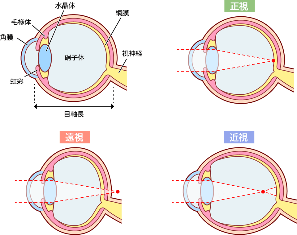 近視は、目の奥行き (眼軸) が「伸びる」ことで起こります。
